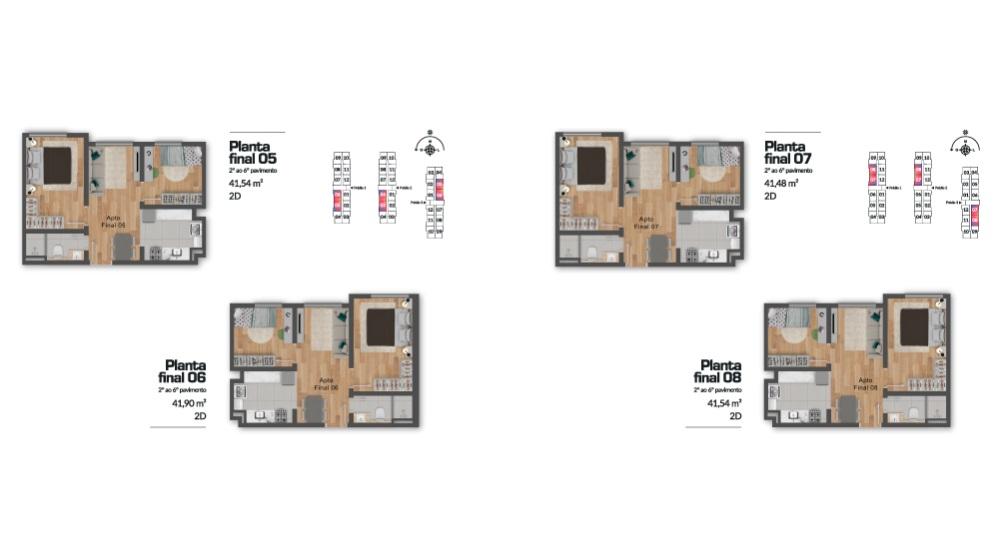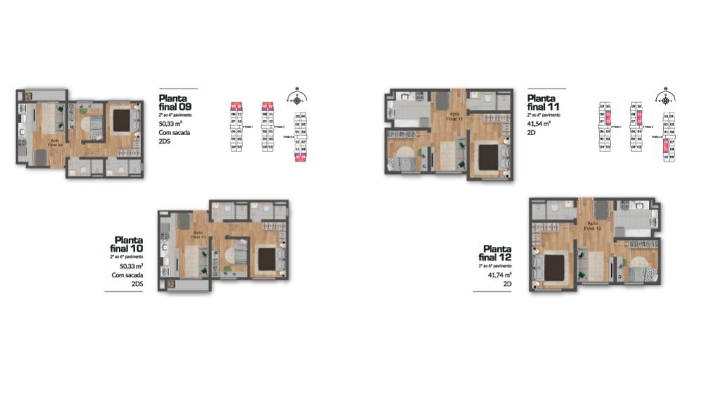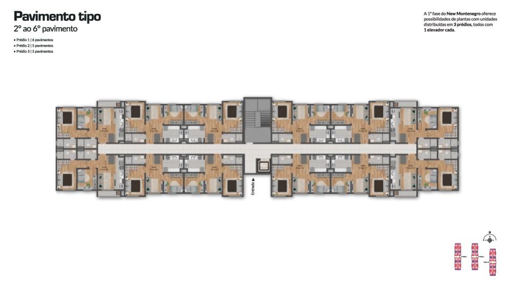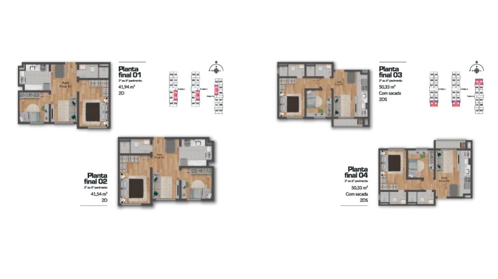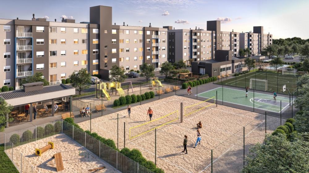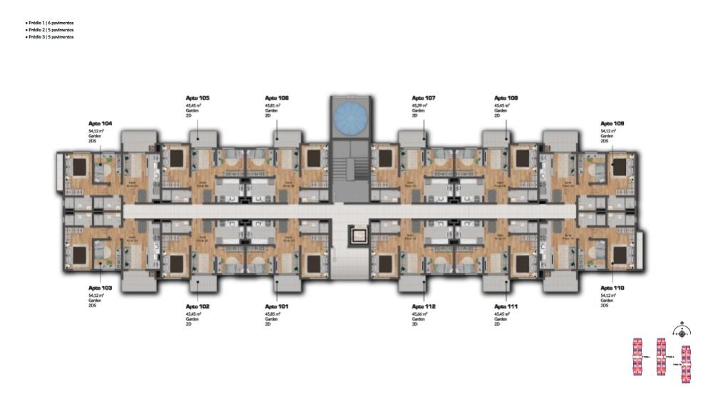 Prédios com 5 pavimentos; Apartamentos de 2 Dormitórios; 2 Dormitórios suíte e Gardens. Unidades com tamanhos entre 41m² e 54m² com sacada.